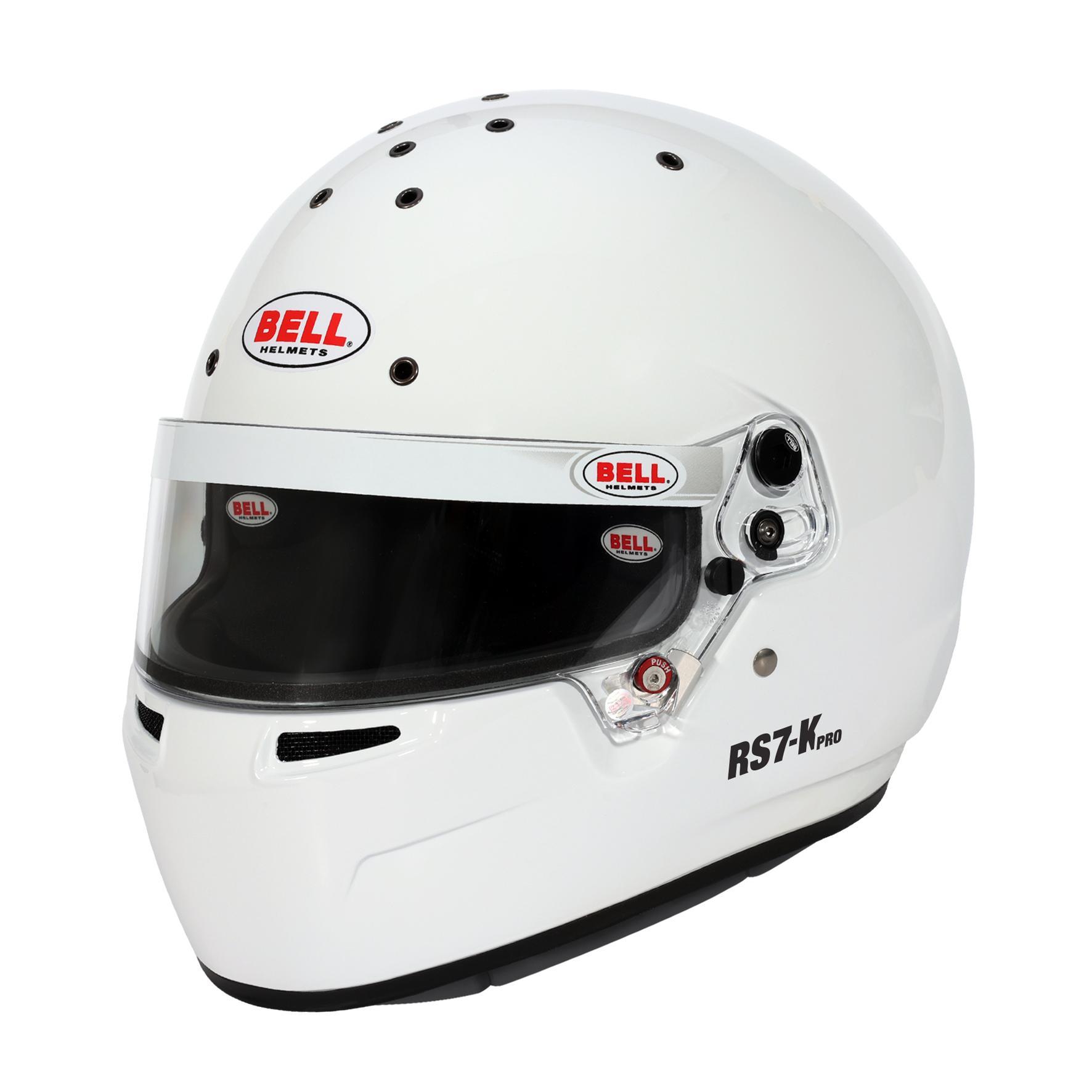 Purpose-built for the hard-charging kart racer, the RS7-K is the karting-only version (non-fire retardant, extra durable interior) of the RS7 series. Based on the HP7 design and featuring a lightweight composite shell, the RS7-K uses an innovative shell and shield design enhancing aerodynamic performance and energy absorbing capacities. The sleek, modern design features an advanced ventilation system, double screen anti-fog (DSAF) visor and a rubber gasket seal ensuring that water does not enter the eye opening in rain conditions. Carbon Fiberglass Composite shell Advanced multi-density, multi-piece liner to maximize energy absorption and impact performance Optical grade injected Double Screen Anti-Fog (DSAF) 3MM visor for anti-fog control and superior visibility Powerful and effective top and chin bar ventilation system with 14 air intake and extraction channels for maximum ventilation Air intake system and rear spoiler available separately Shell and shield design optimized to improve aerodynamic performance, reduce internal noise and enhance energy management capacities RS7-K is NOT compatible with FHR anchor systems or devices Synthetic rubber gasket seal to prevent dirt and water from entering the helmet Shield and pivot kit: SE07 3MM, SV(SE07) Interior: Non-fireproof lining for extra durability Black High Strength – High Comfort Fabric and synthetic leather Equipped with Bell Racing SmartLock Color: White Available as well with exciting and trendy Graphics and Glossy finish: - Stamina Anthracite-Orange - Stamina Anthracite-Yellow